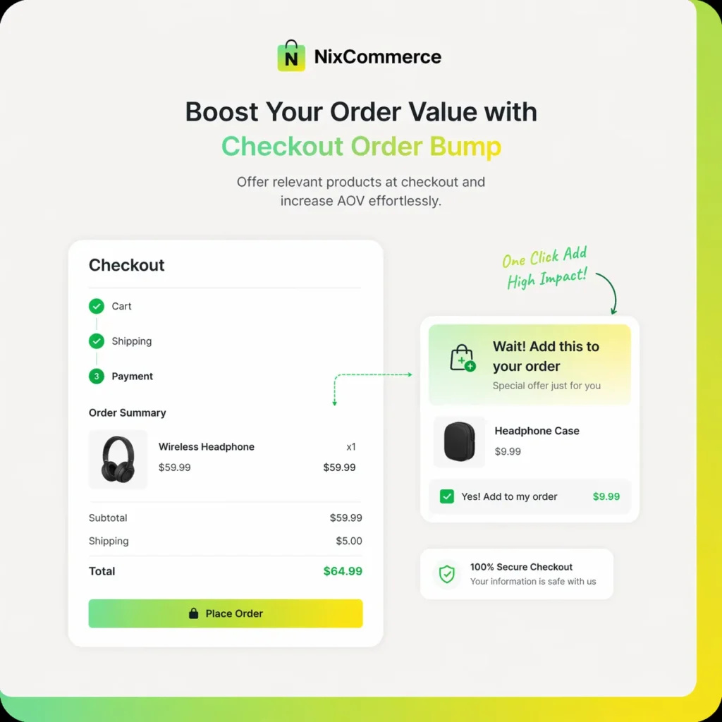 Adds configurable order bump offers to NixCommerce products and shows them below the checkout summary.